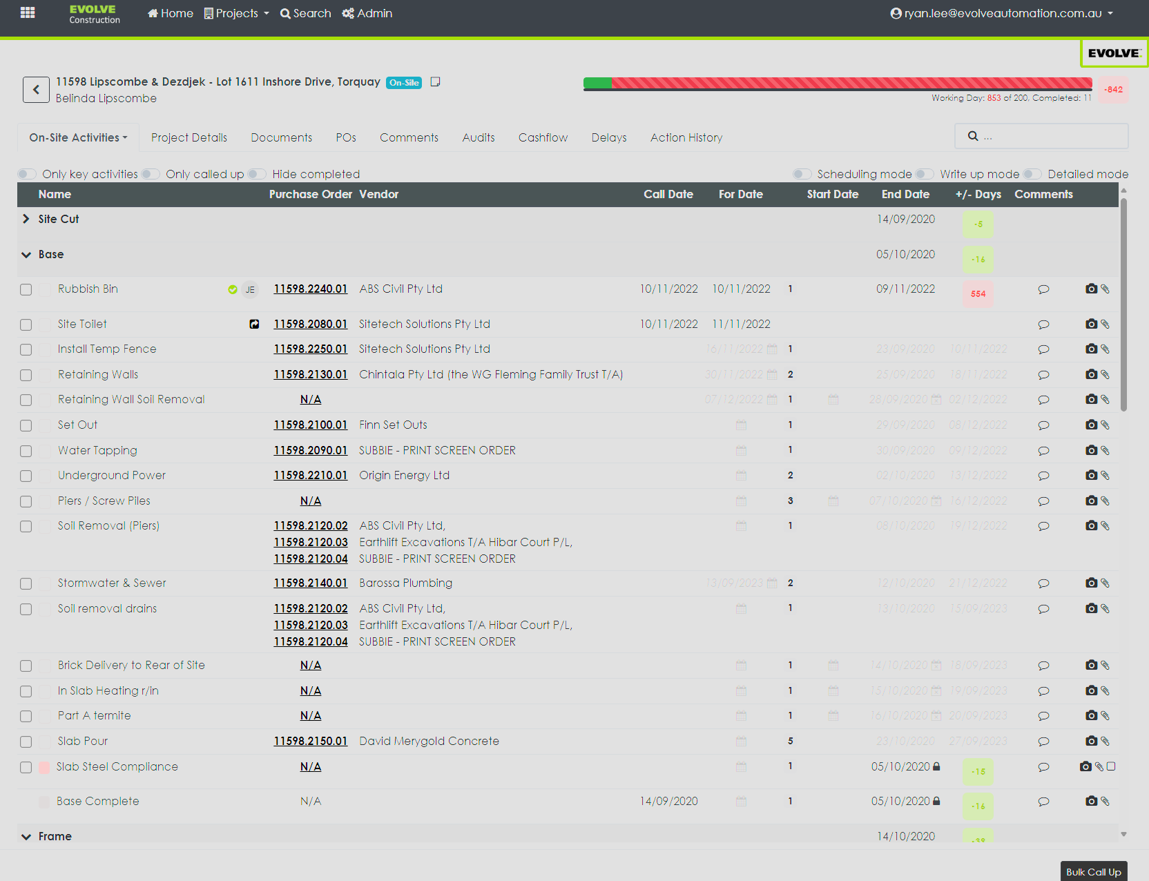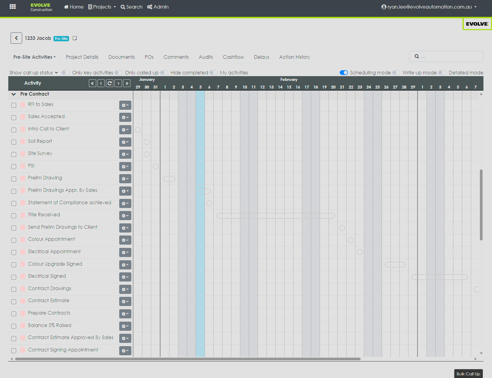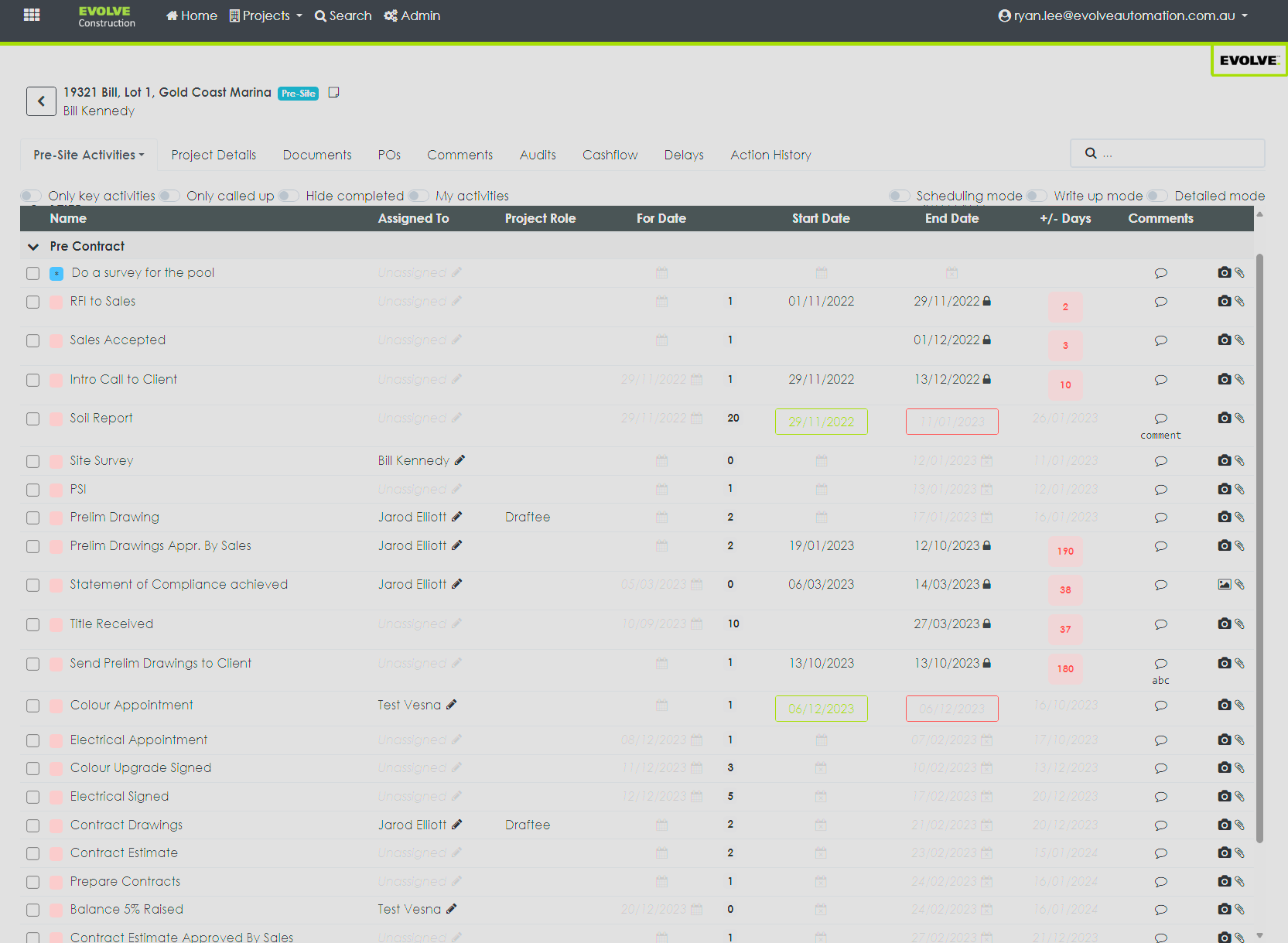 The Evolve Pre-site Module provides comprehensive visibility and control over your pre-site workflows. The system allows for pre-determined and customizable user permissions, and automatic task assignment based on defined roles or management allocation and supports scheduling and resource planning.Pre-built integrations provide for direct access to customer filing systems for real-time access to project documents, as well as quick access to purchase orders and financial job information. This module tracks baseline timelines versus forecasts and actual progress, maintains a time-stamped change register, and provides a comment and notes repository. EOT management and communication capabilities are included, along with automated and customizable customer or supplier communications.